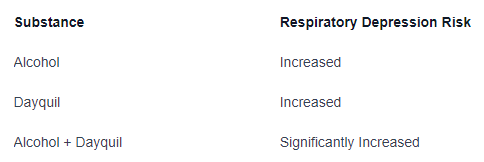 the table below provides a comparison of the potential effects on respiratory function when alcohol and dayquil are used separately and when combined: