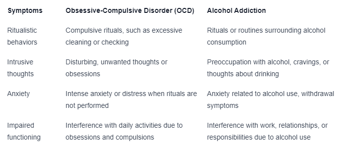 ocd and alcohol addiction may exhibit symptom overlaps, making it challenging to differentiate between the two conditions. some common symptom overlaps include: