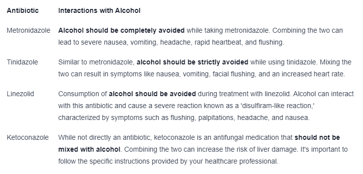 it’s crucial to note that this is not an exhaustive list, and there may be other antibiotics that can interact with alcohol. always consult with your healthcare professional or pharmacist to fully understand the potential interactions and risks associated with the specific antibiotics you are prescribed.