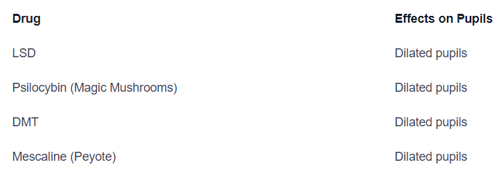 hallucinogenic drugs, such as lsd (lysergic acid diethylamide) and psilocybin (magic mushrooms), are known to cause pupil dilation. these substances alter perception, mood, and cognition, and one of the effects is dilated pupils. the dilation is thought to be a result of the drugs’ impact on the serotonin receptors in the brain.
