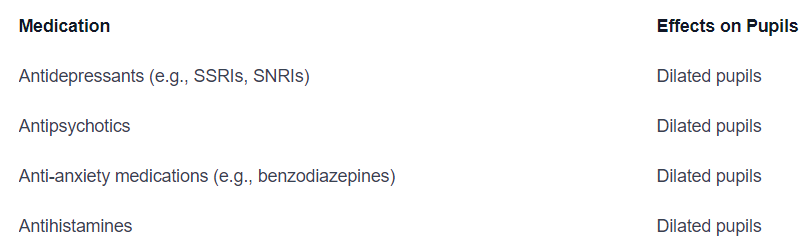 certain prescription medications, even those not classified in the above-mentioned categories, can cause pupil dilation as a side effect. these medications may have various mechanisms of action, leading to pupil dilation. it is essential to consult with a healthcare professional or refer to the medication’s prescribing information for more specific details. some prescription medications known to cause pupil dilation include: