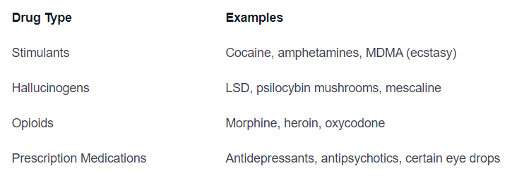 certain drugs, particularly stimulants, hallucinogens, opioids, and some prescription medications, can directly or indirectly stimulate the sympathetic division of the autonomic nervous system, resulting in pupil dilation.