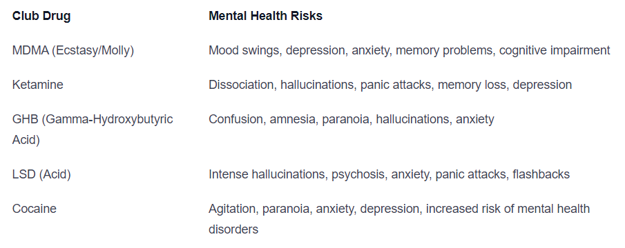 in addition to the physical dangers, club drugs also pose significant risks to mental health. the table below provides an overview of the mental health risks associated with popular club drugs: