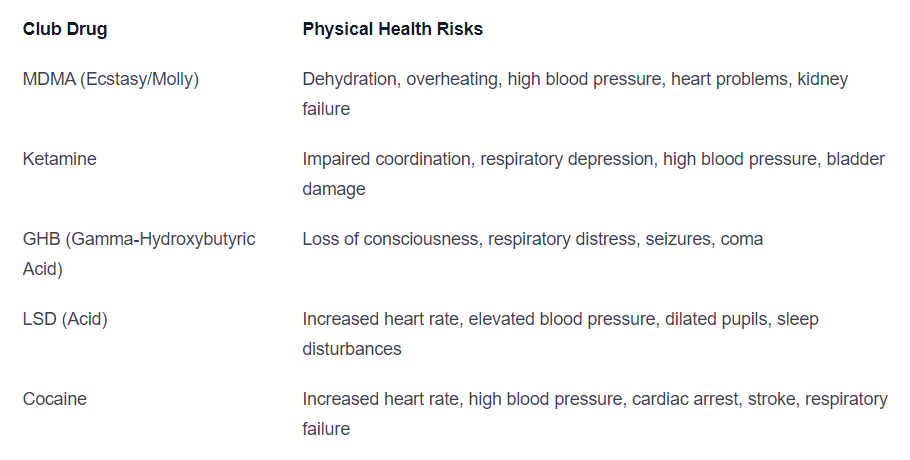 club drugs can have severe physical health consequences. the table below highlights some of the common physical health risks associated with popular club drugs: