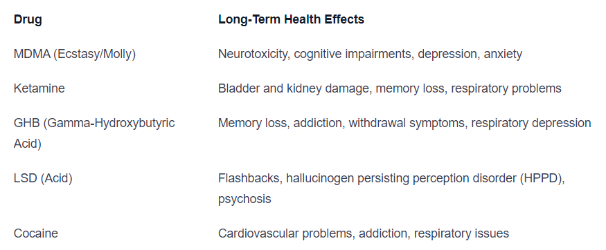 club drugs can have severe long-term health effects on the body and mind. prolonged use of these substances can lead to irreversible damage and chronic health conditions. some of the common long-term health effects associated with popular club drugs include: