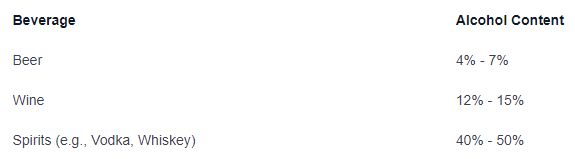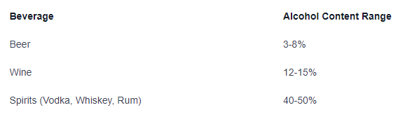 to illustrate the differences in alcohol content, here is a table comparing the range of alcohol percentages in some common alcoholic beverages: