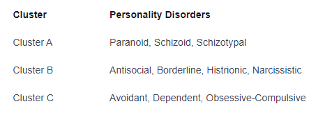 there are several types of personality disorders, each with its own set of defining features. these disorders are grouped into three clusters: