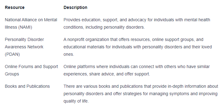 living with schizoid or schizotypal personality disorder can be challenging, but there are numerous support options and resources available. these can provide individuals with guidance, information, and a sense of community. some of the available resources include: